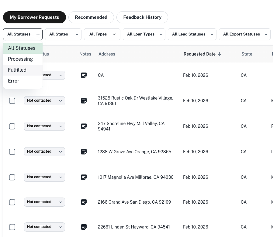 When you're in the Borrowers tab, adjust the filter to "Fulfilled" to see the leads where contact information has already been delivered.